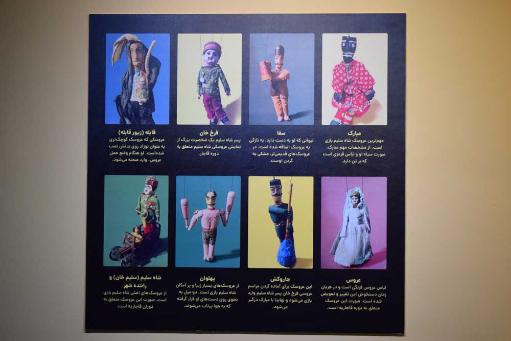 در موزه کودکی ایرانک شما می توانید در ساعات مختلف برنامه های متفاوتی مثل خیمه شب بازی را مشاهده نمائید. در این قسمت تصویر عروسک های خیمه شب بازی را مشاهده می کنید که همگی در نمایش ها نقش فعالی دارند و مورد استفاده قرار میگیرند.