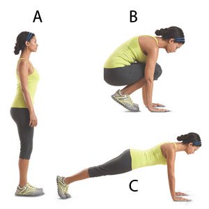 حالت ایستاده، دست ها در کنار بدن و پاها به عرض کمر باز. در یک حرکن زانوها را خم کنید و دستانتان را روی زمین در دو طرف پاهایتان قرار دهید، سپس در یک حرکت پرشی پاهایتان را به عقب ببرید و در وضعیت شنا قرار بگیرید. فرآیند را برعکس تکرار کنید تا به حالت اولیه برگردید. کل این فرآیند یک تکرار حساب میشود.