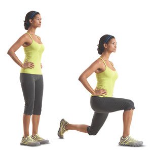 صاف بایستید، پاهایتان را به اندازه ی پهلویتان باز کنید و دستتان را روی پهلوهایتان قرار دهید. با پای راست یک قدم به جلو بردارید و به آرامی بدنتان را پایین بیاورید تا زمانیکه زانوی راستتان حداقل ۹۰ درجه خم بشود. برگردید به حالت اولیه و این بار با پای چپ تمرین را انجام دهید. همه ی این فرآیند یک تکرار حساب میشود.