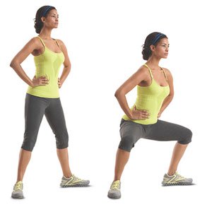 بایستید و پاهایتان را دوبرابر یا سه برابر باز کنید، انگشت شصت به طرف خارج. دستانتان را روی پهلوها قرار دهید. پهلوهایتان را به سمت پایین فشار دهید و بدنتان را به سمت پایین ببرید تا جاییکه ران هایتان با زمین مواززی شود. یک مکث، و سپس به حالت اولیه برگردید. کل این فرآیند یک تکرار حساب میشود.