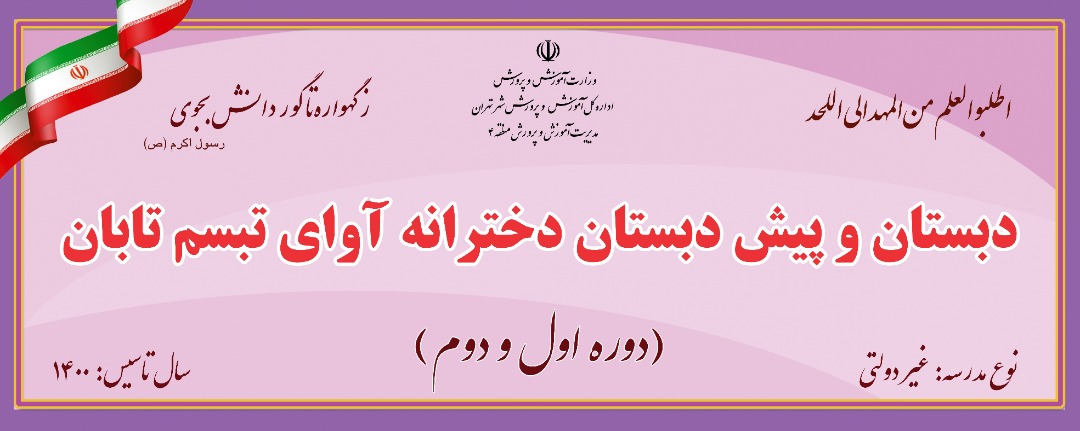 مدرسه دخترانه آوای تبسم تابان(غیردولتی) با مدیریت با تجربه ۱۵ سال مهدکودک آوای تبسم، واقع در استان تهران ، شهر تهران منطقه ۴ در مقطع پیش دبستان و دبستان (پایه اول تا ششم)، پذیرای فرزندان عزیز شما اولیاء گرامی می باشد. جهت کسب اطلاع از شرایط ثبت نام و امکانات مدرسه آوای تبسم تابان با تلفن ۰۲۱۲۲۹۳۳۰۸۲ و ۰۹۱۰۶۲۱۴۷۰۴ تماس گرفته و یا به آدرس میدان هروی، خیابان وفامنش، انتهای خیابان جمالی شرقی، پلاک۶ مراجعه نمایید.